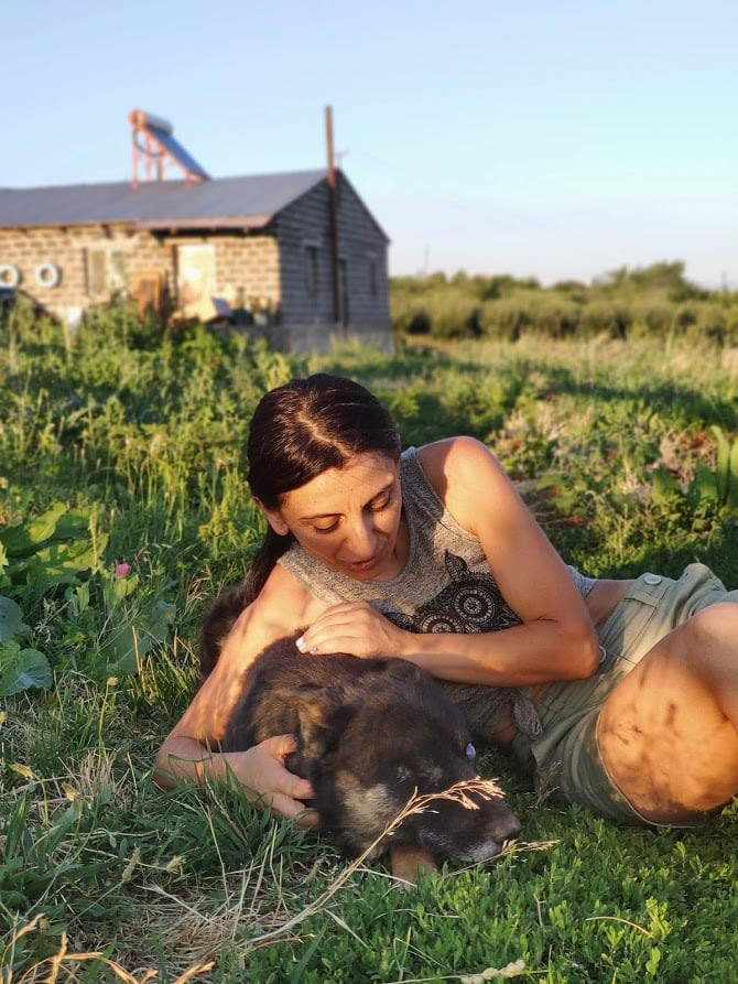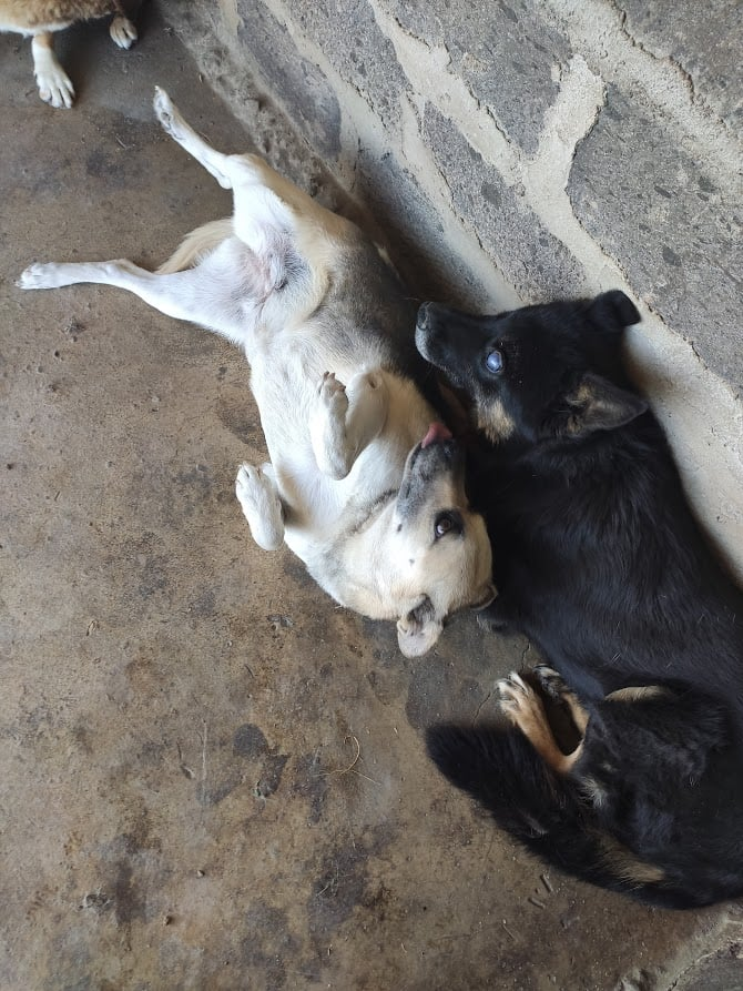 Уголёк переехал жить в вольер. К трём девочкам. Девочки очень обрадовались - зализали и запрыгали его. У Татик (не бабушка, а лапа ;) ) ежедневный ритуал. Она ложится к нему впритык и начинает кокетничать - кувыркается, прижимается, даже залезает на него. слегка. Затем начинает осторожно вылизывать. Татик - терапевтическая. Детские приюты сейчас закрыты для её визитов, вот она и практикуется на Угольке.