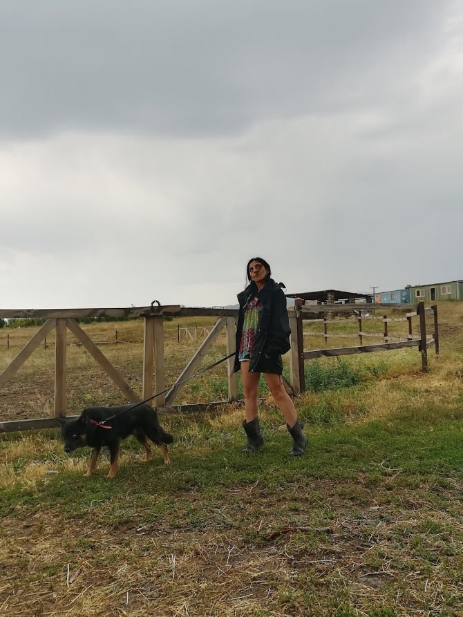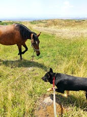 Гуляли на поводке. Дошли до пасущихся лошадей. Фебус равнодушно обнюхал Уголька. Жеффа его не заметила - была занята тем, что тыкала мордой мне в карманы - вдруг там съедобное что завалялось. Истеричная деревенщина Сальма подняла переднюю ногу и набросилась на Уголька. Для неё мир не делится на травоядных и хищников, для неё все, кто проходит мимо, обязательно покушаются на её траву. Уголёк испугался, неожиданно сильно дёрнул, и я свалилась в траншею, по которой как раз пустили оросительную воду.